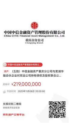 中國中信金融資產(chǎn)管理股份有限公司重慶市分公司(簡稱:中信金融資產(chǎn)重慶分公司)與蕪湖華融資本創(chuàng)榮投資中心(有限合伙)(簡稱:蕪湖華融合伙企業(yè))對重慶雙遠(yuǎn)實業(yè)(集團(tuán))有限公司(簡稱:雙遠(yuǎn)公司)持有債權(quán)及股權(quán),將于2025年11月8日20時至2025年11月9日20時在京東拍賣網(wǎng)通過公開競價方式進(jìn)行處置,拍賣鏈接如下圖所示,現(xiàn)予以公告。